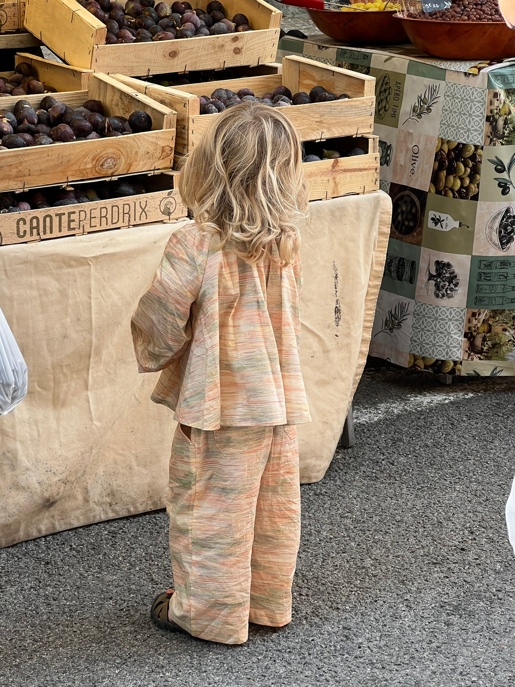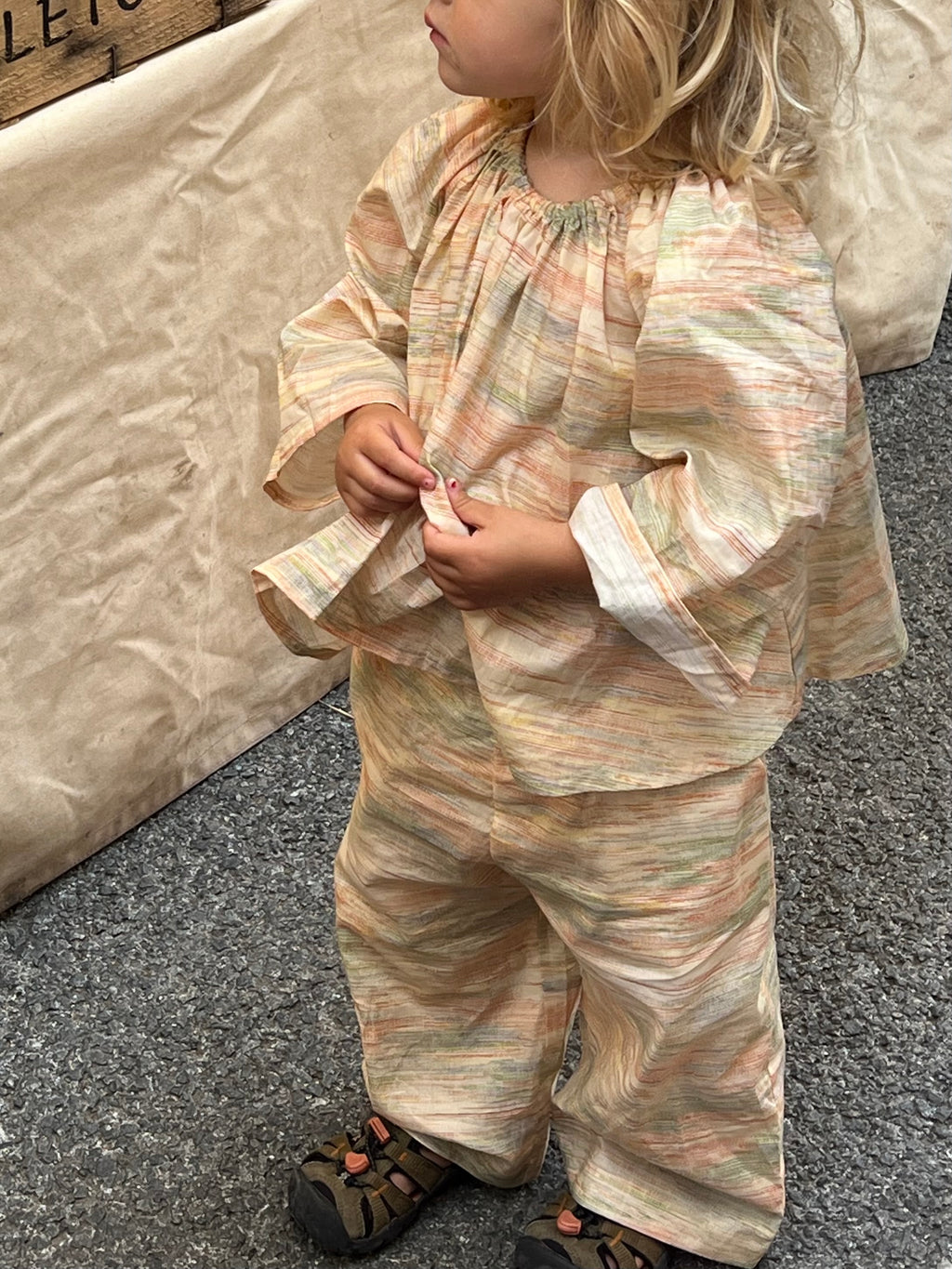 Blomst Liberty sæt i Cloudscape har et løst og let fit med lommer på bukserne både bag på og i siden. Blusen er lavet med elastik i halsen så det er nemt at få af og på. Ærmerne er vidde for at give et elegant look. Sættets silhouet gør det muligt for barnet at passe det i flere sæsoner.