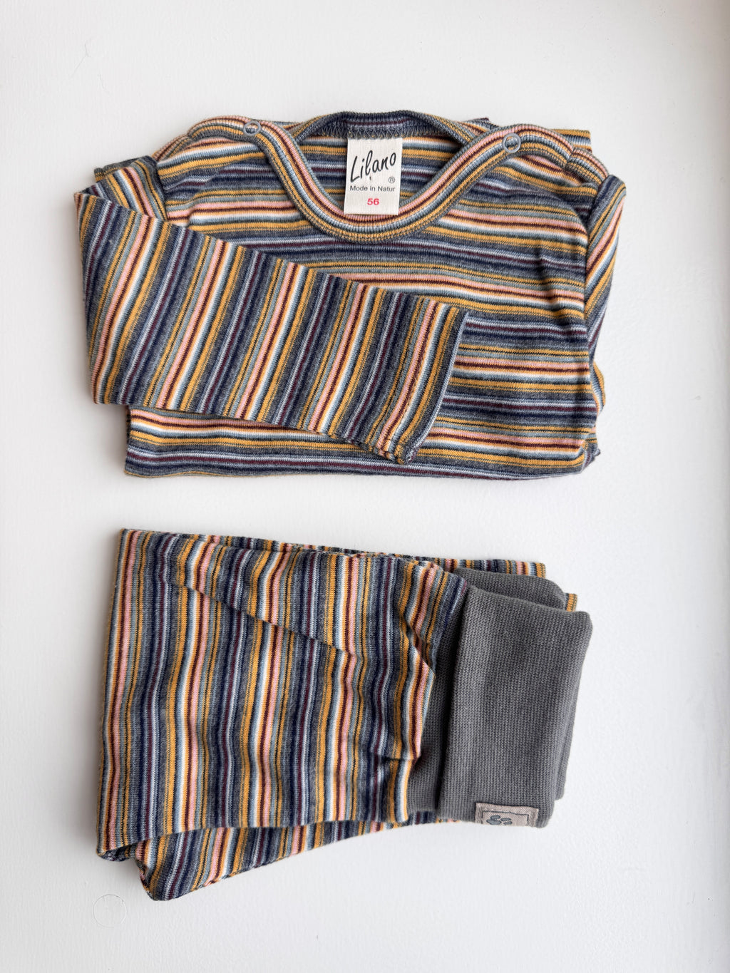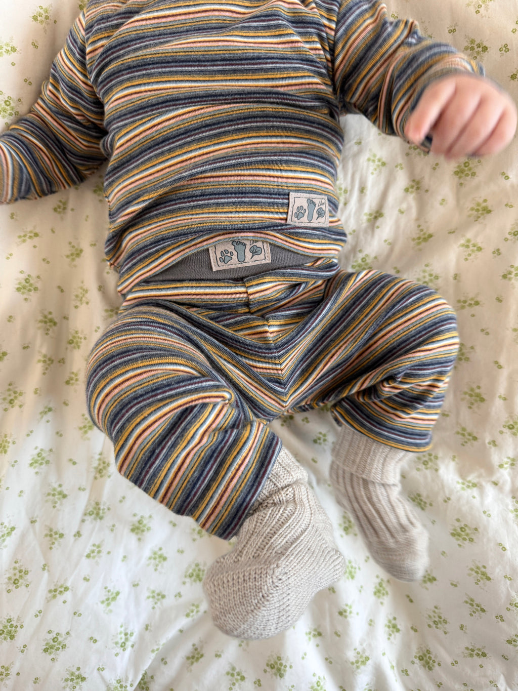 Det blødeste sæt lavet i 100% bomuld. Bukserne har har et bredt stykke i livet og trykknapper ved halsen som gør det behagelig for baby og barnet at have på. Perfekt hele året rundt