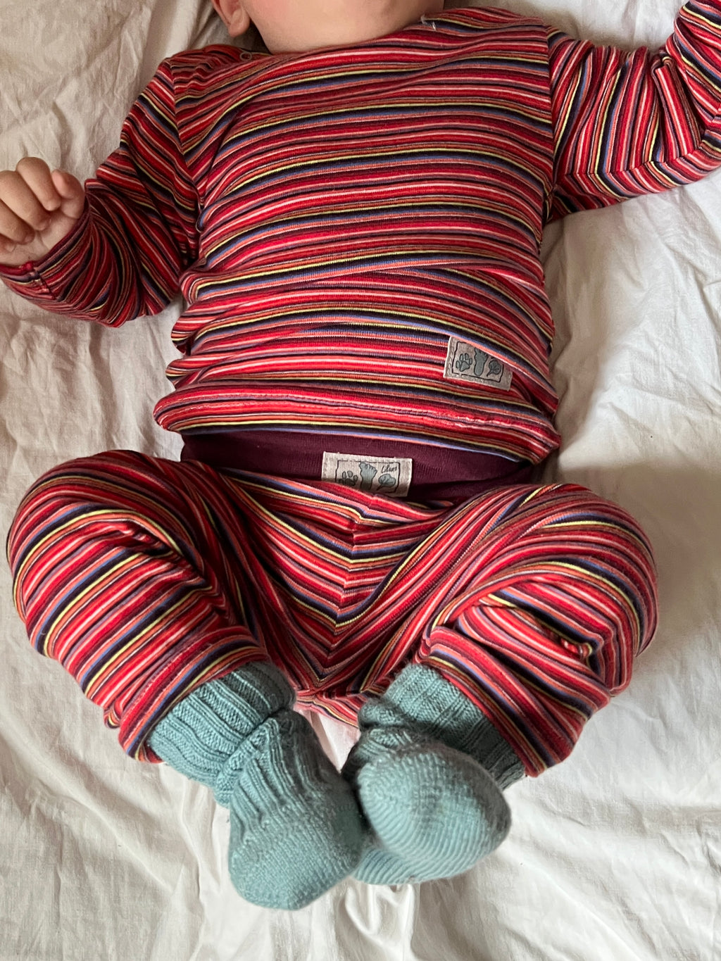 Det blødeste sæt lavet i 100% bomuld. Bukserne har har et bredt stykke i livet og trykknapper ved halsen som gør det behagelig for baby og barnet at have på. Perfekt hele året rundt